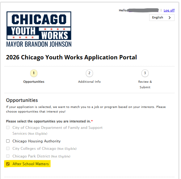 To begin, it's important to be sure to select After School Matters under Opportunities on Step 1 of the CYW application: